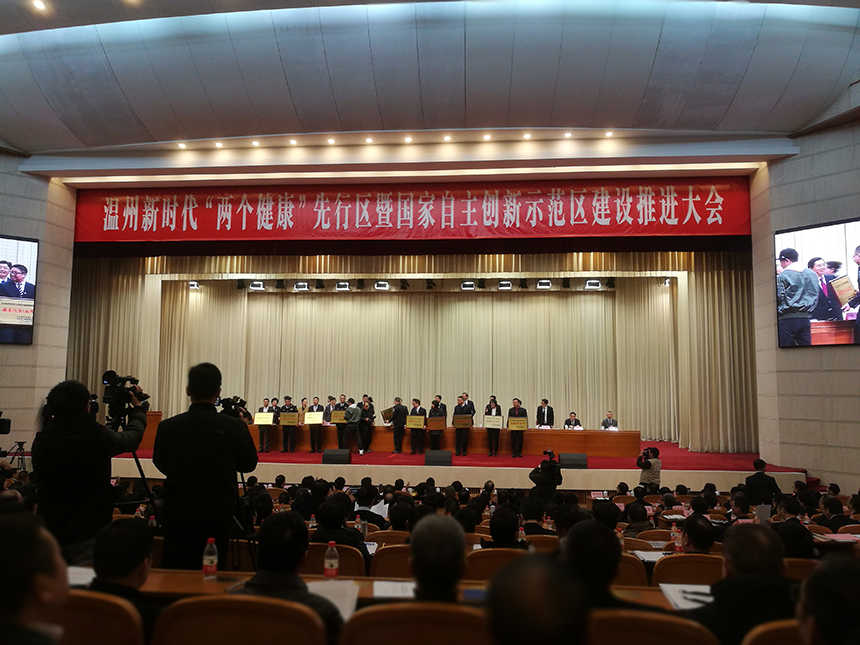 会议设市主会场和县(市、区)、省级产业集聚区分会场。在主会场与会的,不仅有各级干部,还有企业家代表、行业协会负责人,相关高新园区和省市科研院所负责人、科技企业孵化器、科技中介和创投机构代表,以及市民监督团代表、新闻媒体代表。我公司总经理有幸受邀在温州人民大会堂主会场参加温州市委市府召开的新时代“两个健康”先行区暨国家自主创新示范区建设推进大会!
