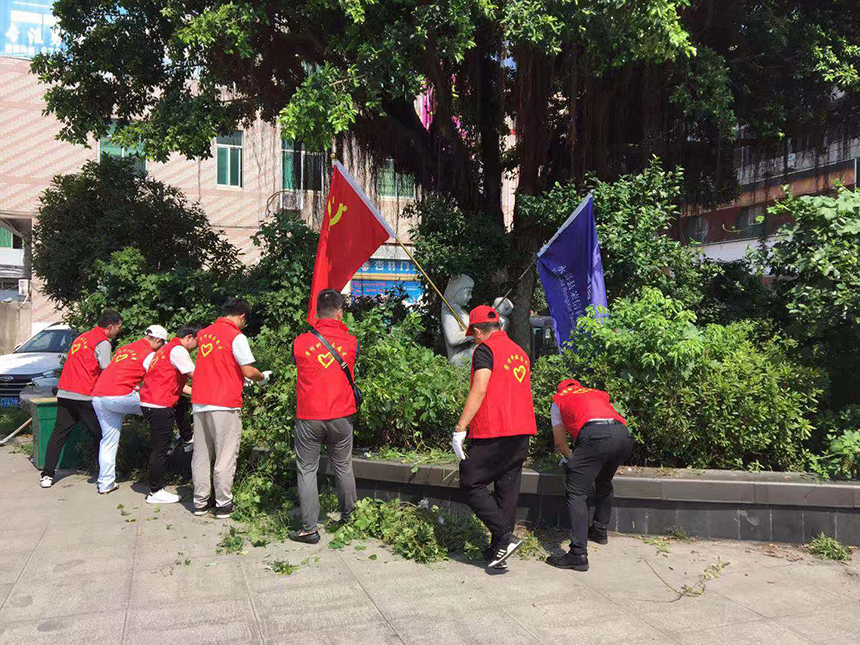 早上9点多,艳阳高照、天气炎热,在乌牛街道统战委员郑寒虎、组织干事李娣的带领下,到杰豪公园开展党员志愿者活动,各位党员冒着烈日,面对眼前的杂草丛生、杂乱无章的荆棘,用自带的锄头、镰刀、大剪刀、铁铲、扫把等工具,立即行动起来,有的锄草、有的割草、有的修剪枝叶、有的拔藤、有的清扫垃圾、有的铲垃圾,大家争先恐后,不怕苦、不怕累,任凭汗水浸湿衣襟,整个劳动现场热情高涨,干劲十足,18位党员和部分员工直到11点多钟完成任务。